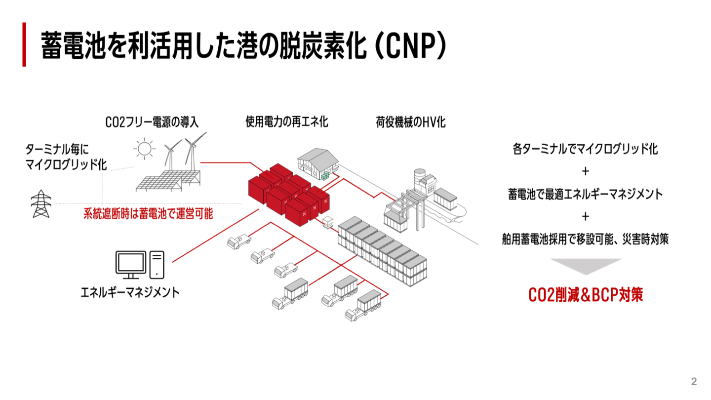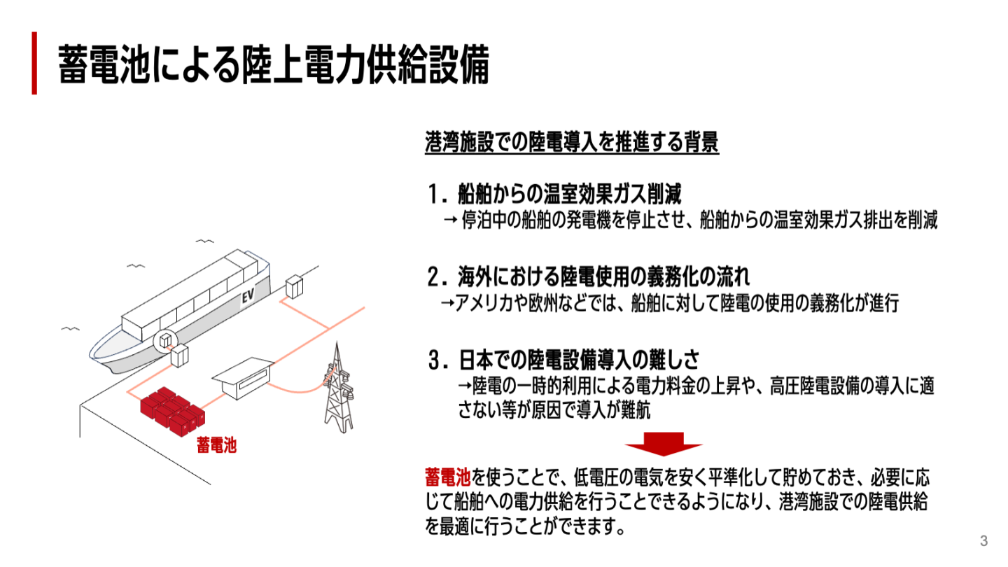 ・港湾脱炭素化推進のための、港湾内における車両EV化、臨海部における蓄電池を利活用した陸電設備の導入等を検討する。